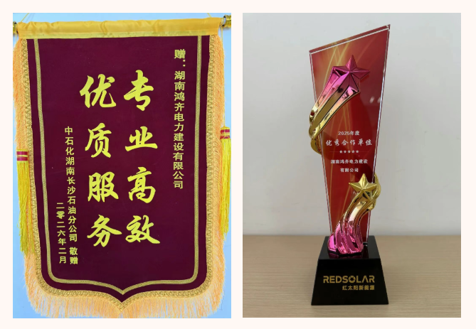 设计方面,鸿齐电力圆满完成中国石化销售股份有限公司-湖南长沙石油分公司普瑞银杉加油站配电工程、乌山充电站配电工程两项设计工作,中石化湖南长沙石油分公司授予“专业高效 优质服务”锦旗,既是对本次两项配电工程设计成果的肯定,也是对公司综合服务能力与履约精神的赞誉。同时,被湖南红太阳新能源科技有限公司授予2025年度 “优秀合作单位”, 亦是对公司在新能源领域设计能力的认可。